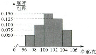 6.A 解析:产品净重小于$100$克的频率为$(0.050 + 0.100)×2 = 0.300$,已知样本中产品净重小于$100$克的个数是 ,设样本容量为$n$,则$\frac{36}{n}=0.300$,所以$n = 120$。净重大于或等于$98$克并且小于$104$克的产品的频率为$(0.100 + 0.150 + 0.125)×2 = 0.75$,所以样本中净重大于或等于$98$克并且小于$104$克的产品的个数约是$120×0.75 = 90$。故选A。