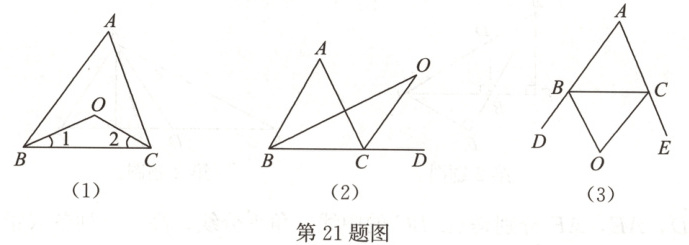 (2)如图(2),O是∠ABC与外角∠ACD的平分线BO和CO的交点,试分析∠BOC与∠A有怎样的关系,并说明理由。