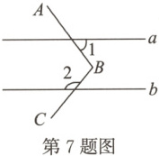 7. 已知a//b,若AB与BC的夹角为120°,∠1=55°,则∠2的度数为(