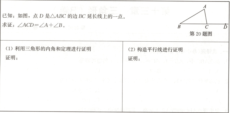 20. (10分)下面是证明“三角形的外角等于与它不相邻的两个内角的和”的方法,请选择其中一种,完成证明。