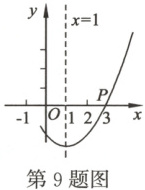 9. 如图,抛物线 $ y = ax^2 + bx + c(a > 0) $ 的对称轴是直线 $ x = 1 $,且经过点 $ P(3, 0) $,则 $ a - b + c $ 的值为(