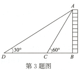 3. 如图,为测量某物体AB的高度,在D点测得A点的仰角为30°,朝物体AB方向前进20米,到达点C,再次测得点A的仰角为60°,则物体AB的高度为(