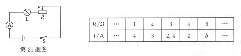 21. (9分)【背景】在一次物理实验中,小莉同学用一个固定电压为12V的蓄电池,通过调节滑动变阻器来改变电流大小,完成控制灯泡L(灯丝的阻值$R_{L}=2 \Omega$)亮度的实验(如图). 已知串联电路中,电流与电阻$R, R_{L}$之间关系为$I=\frac{U}{R+R_{L}}$,通过实验得出如下数据: