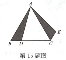15. 如图,$ \triangle ABC $ 是等边三角形,$ D $ 为 $ BC $ 边上的点,$ \angle BAD = 15^{\circ} $,$ \triangle ABD $ 经旋转后到达 $ \triangle ACE $ 的位置,那么 $ \angle AEC $ 的度数是__________.
