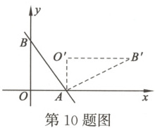 10. 如图,直线$y = -\frac{4}{3}x + 4$与$x$轴、$y$轴分别交于$A$,$B$两点,把$\triangle AOB$绕点$A$顺时针旋转$90^{\circ}$后得到$\triangle AO'B'$,则点$B'$的坐标是(
