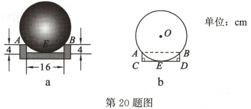 20. (10分)工人师傅为了检测该厂生产的一种铁球的大小是否符合要求,设计了一个如图a所示的工件槽,其中工件槽的两个底角均为$90^{\circ}$,尺寸如图所示. 将形状规则的铁球放入槽内时,若同时具有图b所示的$A$,$B$,$E$三个接触点,该球的大小就符合要求. 图b是过球心$O$及$A$,$B$,$E$三个接触点的截面示意图. 已知$\odot O$的直径就是铁球的直径,$AB$是$\odot O$的弦,$CD$切$\odot O$于点$E$,$AC \perp CD$,$BD \perp CD$. 请结合图a中的数据,计算这种铁球的直径.