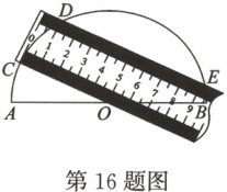 16. 如图,将一把两边都带有刻度的直尺放在半圆形纸片上,使其一边经过圆心$O$,另一边所在直线与半圆相交于点$D$,$E$,量出半径$OC=5$cm,弦$DE=8$cm,则直尺的宽度为
