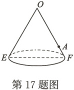 17. 如图是一个用来盛爆米花的圆锥形纸杯,纸杯开口圆的直径$EF$长为10 cm,母线$OE$($OF$)长为10 cm.在母线$OF$上的点$A$处有一块爆米花残渣,且$FA=2$cm,一只蚂蚁从杯口的点$E$处沿圆锥表面爬行到$A$点,则此蚂蚁爬行的最短距离为