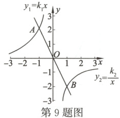 9. 如图,正比例函数 $ y_{1} = k_{1}x $ 和反比例函数 $ y_{2} = \frac{k_{2}}{x} $ 的图象交于 $ A(-1, 2) $,$ B(1, -2) $ 两点. 若 $ y_{1} < y_{2} $,则x的取值范围是(