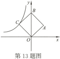 13. 如图,在平面直角坐标系中,菱形OABC的面积为12,点B在y轴上,点C在反比例函数 $ y = \frac{k}{x} $ 的图象上,则k的值为