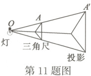 11. 三角尺在灯泡O的照射下在墙上形成影子(如图所示). 现测得OA=20 cm,OA'=50 cm,这个三角尺的周长与它在墙上形成的影子的周长的比是