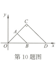 10. 如图,△OAB与△OCD是以点O为位似中心的位似图形,相似比为1:2,∠OCD=90°,CO=CD. 若B(1,0),则点C的坐标为(