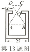 13. 如图,已知零件的外径为25 mm,现用一个交叉卡钳(两条尺长AC和BD相等,OC=OD)量零件的内孔直径AB. 若OC:OA=1:2,量得CD=10 mm,则零件的厚度x=
