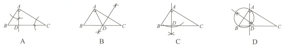 7. 已知在Rt△ABC中,∠BAC=90°,在BC上取一点D,连接AD,使得AD²=BD·CD. 观察下列图中尺规作图的痕迹,其中作法错误的是(