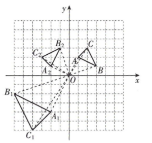 18. (8分)如图,在平面直角坐标系中,网格的每个小方格都是边长为1个单位长度的正方形,点A,B,C的坐标分别为(1,2),(3,1),(2,3),先以原点O为位似中心在第三象限内画一个△A₁B₁C₁,使它与△ABC位似,且相似比为2:1,然后再把△ABC绕原点O逆时针旋转90°得到△A₂B₂C₂.