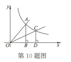 10. 如图,正比例函数$y=x$和$y=mx(m>0)$的图象与反比例函数$y=\frac{k}{x}(k>0)$的图象分别交于第一象限内的$A$,$C$两点,过$A$,$C$两点分别向$x$轴作垂线,垂足分别为$B$,$D$.若$Rt\triangle AOB$与$Rt\triangle COD$的面积分别为$S_1$和$S_2$,则$S_1$与$S_2$的关系为( )
