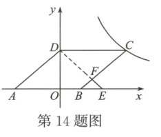14. 如图,在平面直角坐标系中,$O$为坐标原点,$□ ABCD$的边$AB$在$x$轴上,顶点$D$在$y$轴的正半轴上,点$C$在第一象限,将$\triangle AOD$沿$y$轴翻折,使点$A$落在$x$轴上的点$E$处,点$B$恰好为$OE$的中点,$DE$与$BC$交于点$F$.若$y=\frac{k}{x}(k\neq0,x>0)$的图象经过点$C$,且$S_{\triangle BEF}=1$,则$k$的值为__________.