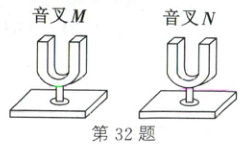 32. (2023·广州)如图,音叉M、N完全相同,M发出440Hz的声音,原来静止的N随之振动,N也发出440Hz的声音,则(
