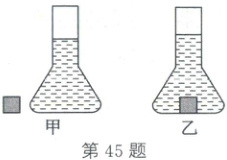 45. (2025·凉山)如图甲所示,在上、下截面均为圆形的锥形瓶内,装有一定量的水。已知锥形瓶上部分是横截面积为16 cm²的圆筒,且粗细均匀,底面积为100 cm²。现将质量为32 g、棱长为2 cm的正方体合金块放入锥形瓶内,水未溢出,如图乙。求:(g取10 N/kg)