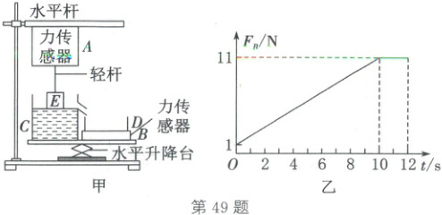 49. (2025·泸州)科创小组的同学设计了如图甲所示的力学综合实验装置。力传感器A上端固定在水平杆上,下端通过竖直轻杆与正方体E相连,水平升降台上放有溢水杯C和力传感器B,小桶D放在力传感器B上,溢水杯C中的水面刚好与溢水口齐平。水平升降台匀速上升,当t=0时,正方体E刚好接触水面,之后排开的水全部流入小桶D中,力传感器B的示数F_B随时间t变化的关系如图乙所示。已知g取10N/kg,ρ_水=1.0×10³kg/m³。