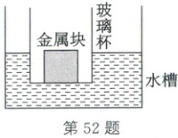 52. (2025·内蒙古)某同学想知道将船上的船锚抛入水中沉底后,会引起水面如何变化。他用玻璃杯和金属块模拟抛锚过程如下:先向底面积为0.1m²的长方体水槽中注入0.2m深的水;将一个质量为3kg、底面积为0.01m²的正方体金属块,放入水平放置的玻璃杯中,再将玻璃杯放入水槽中,玻璃杯漂浮在水面上静止,如图所示;然后将金属块从玻璃杯中取出放入水中沉底、待水面稳定后,分析水面变化。(ρ_水=1.0×10³kg/m³,g取10N/kg,整个过程中没有水溢出)求: