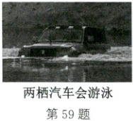 59. (2025·龙东地区)如图,这是一款国产水陆两栖汽车航行技术测试的现场。这辆汽车在水中的最大速度约为8.3km/h。良好的密封技术和防锈处理,使车体的吃水深度达到1.05m,满载时排开水的质量达到4×10³kg。求:(g取10N/kg)