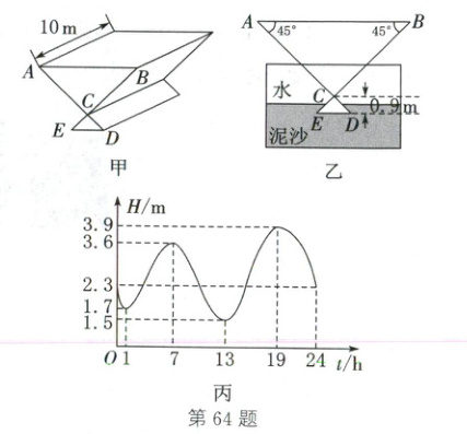 64. (2025·威海)如图甲所示,某航海器由钢板焊接的两个空心三棱柱组成。侧面为ABCDE;在△ABC中,AB=8m,AC=BC,∠ACB=90°;在△CDE中,底边DE的高为0.9m;两个三棱柱棱的长度均为10m,下方三棱柱体积为6m³,航海器总重为1.2×10⁶N。(ρ_水=1.0×10³kg/m³,g取10N/kg,三棱柱体积=三角形面积×棱的长度)