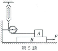 5. (2025·达州)“奇思妙想”小组组装了如图所示装置,测量滑动摩擦力大小。长木板 B 置于水平面,在水平拉力 F = 5 N 作用下向右做匀速直线运动,速度为 0.15 m/s,弹簧测力计的示数为 2 N。拉力 F 的功率为