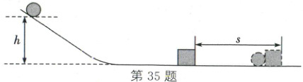 35. (2023·潍坊)为探究物体的动能跟哪些因素有关,利用斜槽、钢球、木块等器材在同一水平面上进行探究活动。钢球从高为$h$的斜槽上滚下,在水平面上运动,运动的钢球碰上木块后,能将木块撞出一段距离$s$,如图所示。