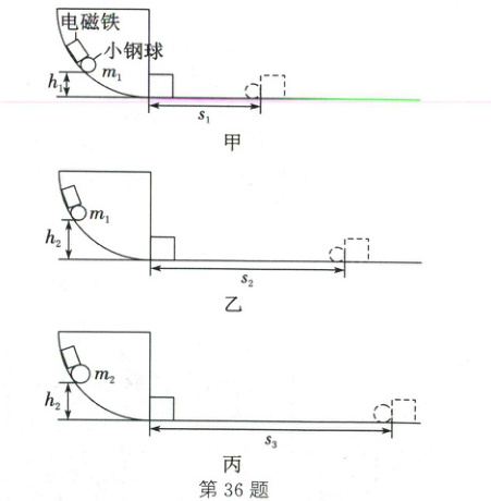 36. (2023·兰州)近年来,渣土车因“多拉快跑”而引发的交通事故时有发生,引起了交通管理部门的高度重视。小彤设计了如图所示的实验来模拟汽车超速、超载带来的危害,通过电磁铁的控制,让质量分别为$m_{1}$和$m_{2}(m_{1}\lt m_{2})$的小钢球从圆弧轨道的一定高度$(h_{1}\lt h_{2})$由静止滚下,撞击水平面上的纸盒并将纸盒推动一段距离。(实验中的圆弧轨道、水平面和纸盒均不变)