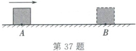 37. 木块在水平桌面上沿直线从A点滑行至B点刚好停止,已知木块在A点时的动能为60J,则木块在A、B两点间运动需要克服阻力做功60J,方式一中,用水平推力从B点推动木块,使其达到某一速度后,保持这一速度推动至A点,则到达A点时木块速度不为零,动能不为零,则推动木块做功的能量大于60J,所以方式一不可行;方式二中,用水平推力从B点推动木块,使其运动一段距离后,撤去推力,木块恰好能滑行至A点,克服阻力做功不变,仍为60J,所以推动木块做功60J,所以方式二可行。
