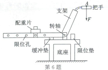 6. (2025·武汉)为了增强市民身体素质,武汉很多公园安装了各式各样的健身器材。使用如图所示的器材时,将配重片调节至合适的限位孔,紧握把手向下拉,支架就可以绕着转轴转动,底座上的缓冲垫可以防止支架回落时噪声过大、限位垫可以防止支架转动角度过大。已知配重片的质量为10kg,相邻限位孔之间距离为15cm。(g取10N/kg)