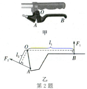 2. (2025·安徽)图甲所示为自行车的手闸,将其OAB部分简化为如图乙所示的杠杆,忽略杠杆自身的重力,当杠杆平衡时,施加在B点的动力F₁=15N,测得l₁=12cm,l₂=4cm,则阻力F₂=