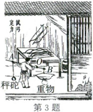 3. (2024·泰州)“试弓定力”是《天工开物》中记载的一种测量弓弩最大弹力的方法。如图所示,O点为提纽处,若AO:BO=3:1,秤砣重150N,忽略秤杆重,秤杆平衡时,弓弦所受的拉力为