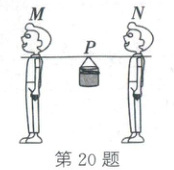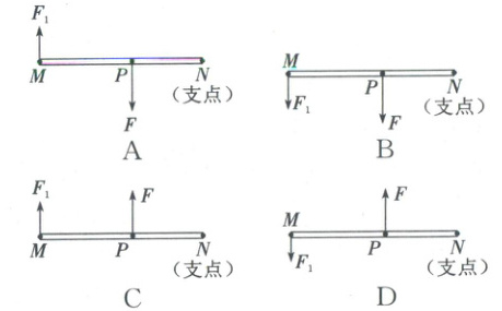20. (2025·河南)如图,在植树活动中,两位同学用竹竿抬水。水桶挂在水平竹竿的 $ P $ 处,与前、后同学的距离分别为 $ PM $、$ PN $,水桶对竹竿的作用力为 $ F $,其中 $ PM $、$ PN $ 及 $ F $ 的大小均已知,竹竿的重力忽略不计。若要分析前面同学抬水的力 $ F_{1} $ 的大小,下列建构的杠杆示意图正确的是(