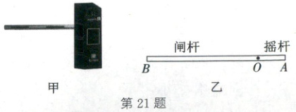 21. (2025·镇江)图甲所示为停车场的电子闸杆,其结构图如图乙所示,闸杆和摇杆组成一根可绕转轴 $ O $ 转动的杠杆,闸杆质量分布均匀,摇杆质量不计,当力 $ F $ 作用于 $ A $ 点时,闸杆恰好能够向上转动,关于此瞬间说法正确的是(