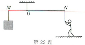 22. (2025·云南)《天工开物》中记载了我国古代的井上施工装置,其简化模型如图所示,$ O $ 为支点,$ OM:ON = 1:2 $,$ M $ 端用绳子悬挂重 $ 200N $ 的物体,在 $ N $ 端用竖直向下的拉力在 $ 1s $ 内使物体缓慢上升了 $ 0.5m $。忽略杠杆和绳的自重,下列说法正确的是(