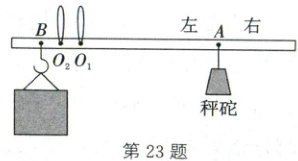 23. (2025·自贡)如图,$ O_{1} $、$ O_{2} $ 均是杆秤称量时的支点。当使用 $ O_{1} $ 称量时,调整秤砣至 $ A $ 点位置,使秤杆处于水平平衡状态(忽略绳重和杆重),已知秤砣质量为 $ 5kg $,$ O_{1}A = 110cm $,$ O_{1}B = 10cm $。下列说法正确的是(