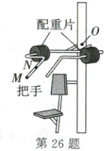 26. (2025·湖北)如图为坐式推肩训练器。健身杆能绕 $ O $ 点处的轴上下转动,配重片可增减,人在座椅上双手紧握把手竖直向上推杆以锻炼肩部肌肉。下列说法正确的是(