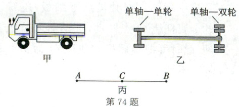 74. (2025·北京)图甲所示的载货汽车,其前面为“单轴—单轮”(一根轴上有2个车轮),后面为“单轴—双轮”(一根轴上有4个车轮),如图乙所示。装货后该货车总质量为16t,每个轮胎与地面的接触面积约为400cm²。实际货车和货物整体的重心到前、后轴的距离一般不相等,常偏向车的后半部,为简化研究问题,假设整体重心C到前、后轴的距离相等,水平地面对货车前面两个车轮的作用力相等,等效作用在A点;水平地面对货车后面四个车轮的作用力均相等,等效作用在B点;因此,货车可看成水平杠杆,如图丙所示,AB距离等于前、后车轴间的距离,C在AB中点。g取10N/kg。