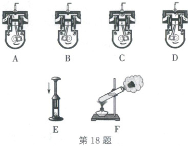 18. (2023·自贡)如图所示,图 A、B、C、D 是四冲程汽油机的工作示意图,图 E、F 是演示实验的示意图。图 B 是