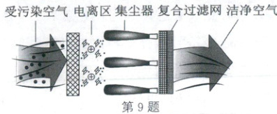 9. (2025·兰州)为了提升人们的生活品质,一些家庭安装了空气净化器,其工作原理如图所示。受到污染的空气被净化器吸入后,颗粒物进入电离区带上电荷,然后在集尘器上被带金属网捕获。金属网吸引颗粒物的原理是
