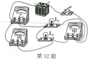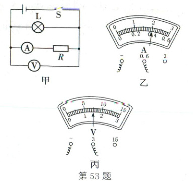 53. (2025·广元)如图甲所示电路,闭合开关S,电流表和电压表的示数如图乙和丙所示,下列分析正确的是(