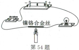 54. (2025·广西)在如图所示的电路中,用点燃的蜡烛对镍铬合金丝加热。发现小灯泡缓慢变暗。分析可知,镍铬合金丝的阻值变大,而导致其阻值变化的主要因素是(