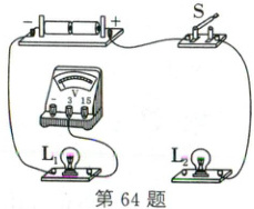 64. (2025·陕西 B 卷)如图,请用笔画线代替导线按要求完成电路连接。要求:小灯泡$L_{1}$与$L_{2}$串联,电压表测量小灯泡$L_{1}$两端的电压。