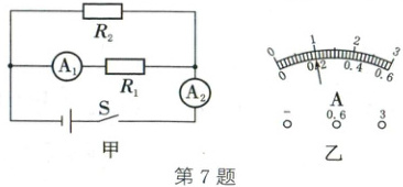 7. (2025·凉山)在如图甲所示电路中,电源电压恒定,定值电阻 R₁ 的阻值为 20 Ω。闭合开关 S,两电流表的指针均指在如图乙所示的位置。则电源电压为