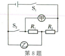 8. (2024·南充)如图所示电路,若甲、乙两表为电流表,闭合开关 S₁,断开开关 S₂,两表指针位置相同,则 R₁:R₂=