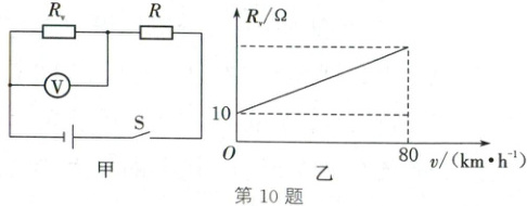 10. (2025·眉山)超速是引发交通安全事故的因素之一。物理兴趣小组设计了一种超速自动报警装置,当车速过快时,提醒驾驶员需要减速。如图甲所示为该装置的简化电路图,电源电压为 12 V,定值电阻 R 为 10 Ω,Rᵥ 为速度传感器,其阻值随车速变化的关系图像如图乙所示。由图乙可知,当汽车的行驶速度逐渐增大时,电压表的示数