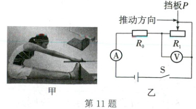 11. (2024·泰州)如图甲所示是进行“坐位体前屈”体质测试的情景。小华所在项目化学习小组设计了一个功能相似的测试模型,其原理电路如图乙所示,电源电压为 6 V 不变,R₀ 的阻值为 30 Ω,电阻 R₁ 用总长为 30 cm、粗细均匀的电阻丝制成(其电阻与长度成正比),挡板初始位置在 R₁ 最左端。闭合开关,向右推动挡板的过程中,电流表示数______