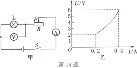 14. (2025·广安)如图甲所示,电源电压保持不变,小灯泡 L 的额定电压为 6 V,闭合开关 S 后,当滑片 P 从滑动变阻器右端滑到左端的过程中,小灯泡 L 的 U-I 关系图像如图乙所示,则电源电压为
